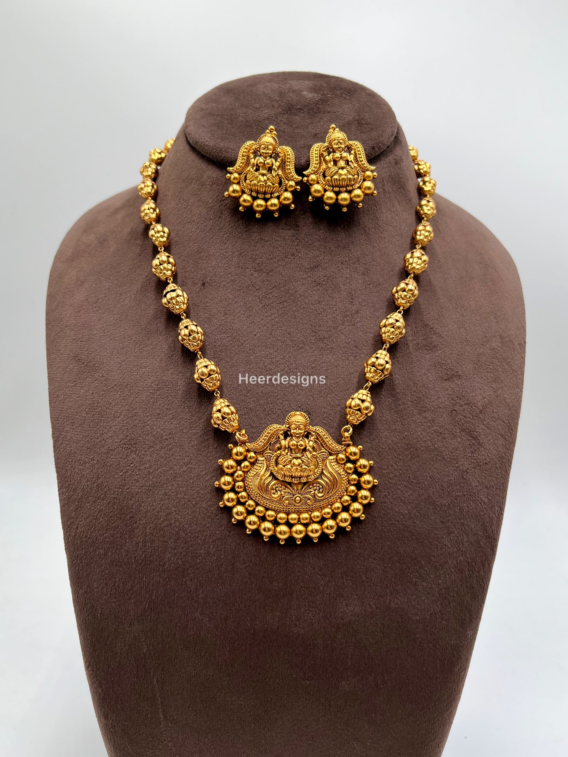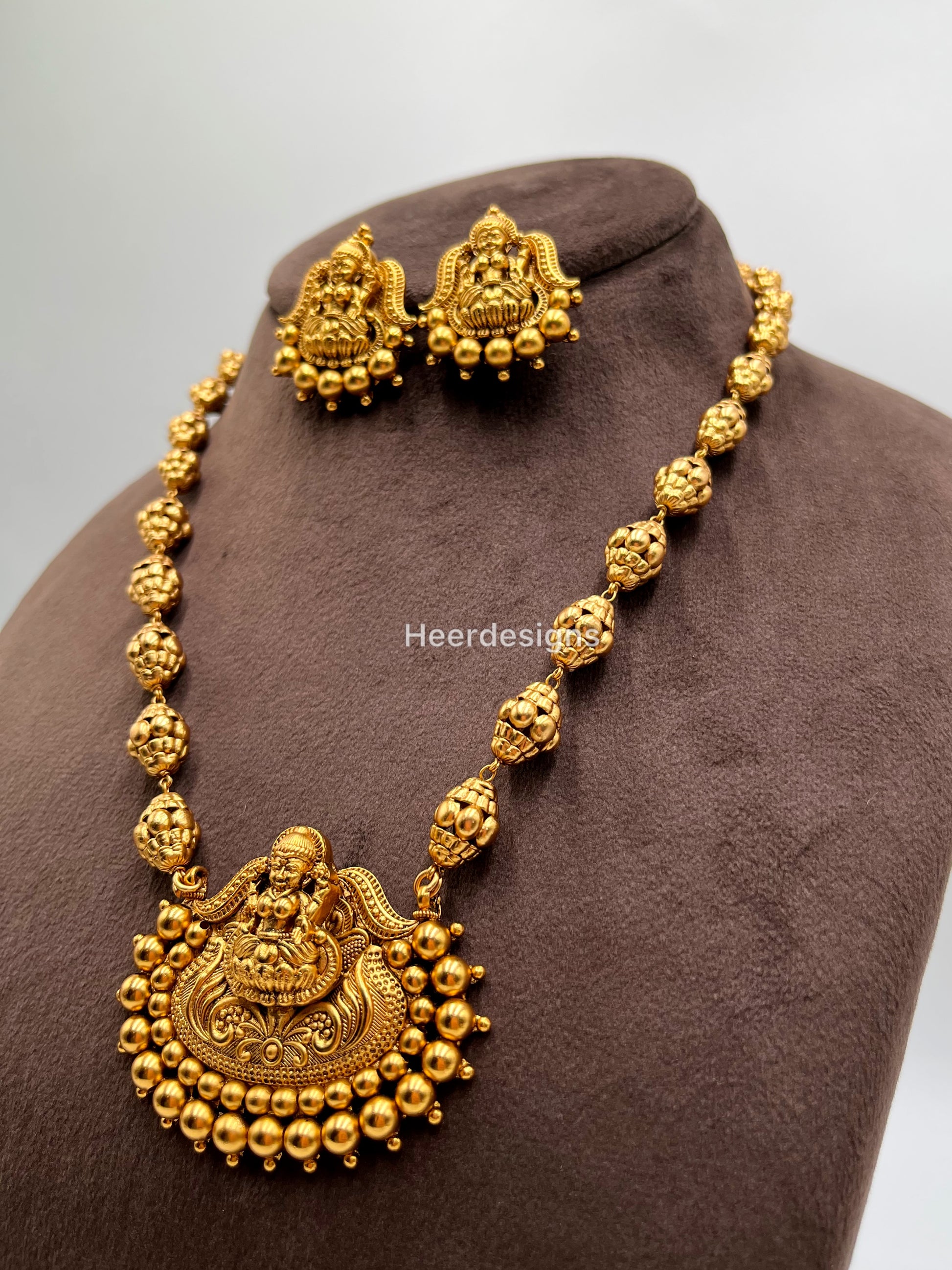 Inspired by the aura of the goddess, this traditional long necklace reflects the sanctity of prayers and the strength of womanhood.The graceful goddess earrings complete the look, making it a perfect blend of spirituality and style.