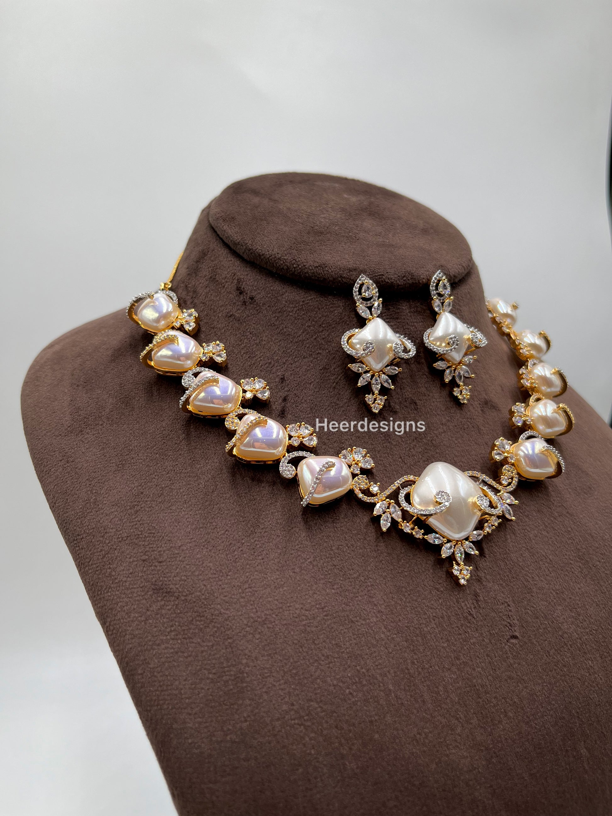 A timeless creation where luminous pearls meet sparkling American diamonds, set in an anti-tarnish gold and silver finish. Designed to preserve its shine and elegance, this necklace reflects sophistication that stays as radiant as you.